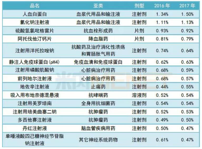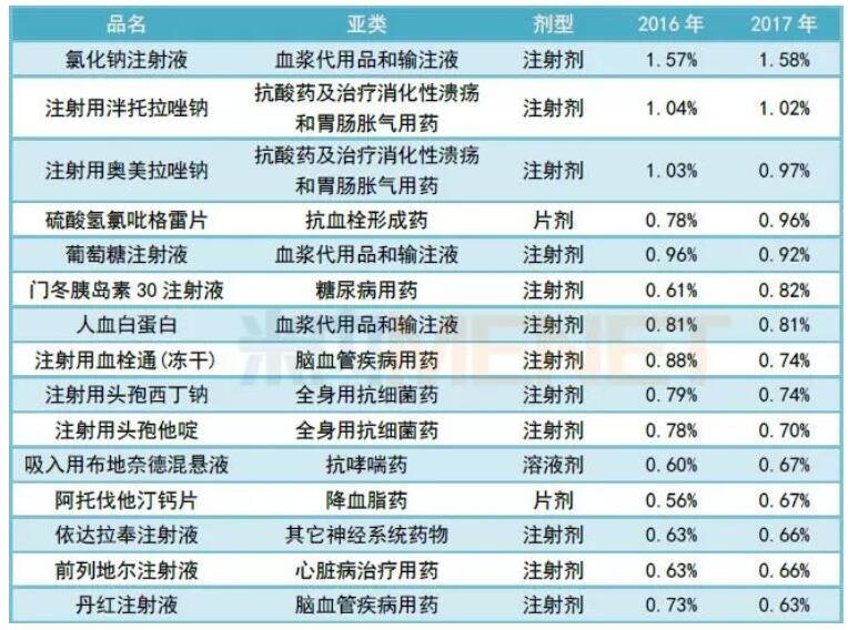 表1:2017年城市公立医院TOP15品种的市场份额