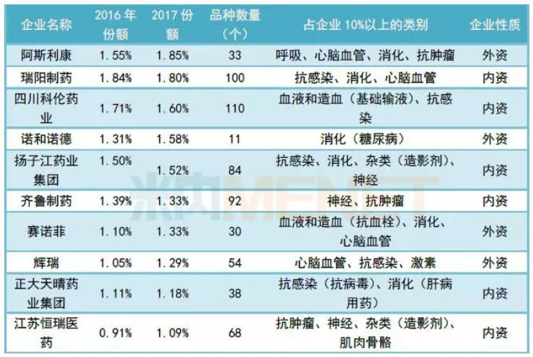 从企业集中度来看,公立医院企业的市场集中度相对较高,TOP100家企业占了五成以上的市场份额。城市公立医院是以外资企业为主,特别是产品线丰富的大型药企,以大病、重病用药为主,内资药企则专注于专科用药;县级公立医院则以内资企业为主,产品丰富,外资份额增速快,以常见病,多发病类别为主。