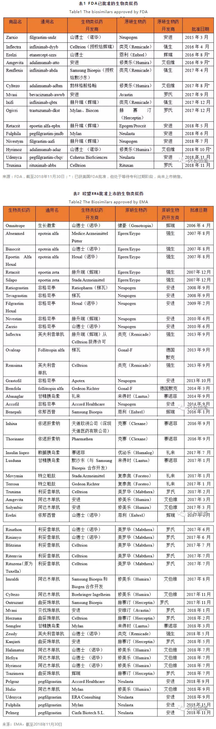 根据对目前在美国FDA、欧盟药品管理局(EMA)批准上市的生物类似药的统计显示(见表1和表2),欧盟作为最先在全球建立起完善的生物类似药监管体系的成熟市场,自2006年批准第1个生物类似药(Omnitrope)起,截至2018年11月30日已批准上市的生物类似药产品共52个(不包含已撤市产品)。2006—2012年,EMA批准上市的生物类似药主要是第一代重组蛋白药物。在2013年,EMA批准了英夫利昔单抗的生物类似药即Remsima的上市,使其成为全球首个上市的单抗类生物类似药。2013—2018年,EMA批准在欧盟上市的生物类似药产品类别重点转向了单抗、融合蛋白、胰岛素类似物等复杂生物药,该期间在欧盟上市的生物类似药产品数目为41个,其中单抗类生物类似药产品数占比约一半,包括多年排在畅销药榜单前列的英夫利昔单抗(4个)、阿达木单抗(8个)、利妥昔单抗(6个)、曲妥珠单抗(4个)。与欧盟相比,美国作为全球处方药与生物药的最大单一市场,却在生物类似药的监管法规指南体系建设方面相对落后,直到2015年3月FDA才正式以生物类似药简化申请途径批准首个生物类似药产品即山德士(诺华)研发的Zarxio(filgrastim-sndz)在美国上市,然而,近年来美国FDA批准的生物类似药上市进程呈现加快的趋势,FDA不仅比EMA更早地批准了阿达木单抗的2个生物类似药上市,FDA还在2017年率先批准了贝伐珠单抗、曲妥珠单抗的生物类似药上市。目前,FDA批准的生物类似药有15个,然而,由于艾伯维的Humira(阿达木单抗)、安进的Enbrel在美国的原研产品专利还未到期,使得其中4个生物类似药即安进的Amjevita、山德士的Erelzi和Hyrimoz 、勃林格殷格翰的Cyltezo目前还无法进入美国市场。此外值得注意的是,由于FDA药监法规的历史原因,部分激素类重组蛋白药物之前通过新药申请(NDA)途径注册上市,目前另外还有2个可视为生物类似药的产品即山德士的Omnitrope(生长激素)和礼来的Basaglar(甘精胰岛素)是通过505(b)(2)途径获得批准进入美国市场[11]。