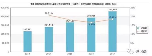 根据公开资料引用的米内网数据显示,二甲双胍为国内口服降糖药通用名市场规模第二的药品。2017年二甲双胍在全国公立医疗机构销售额为36.59亿元,市场增长率达到18.42%。加上零售市场的规模,预计合计市场规模在45亿元左右。