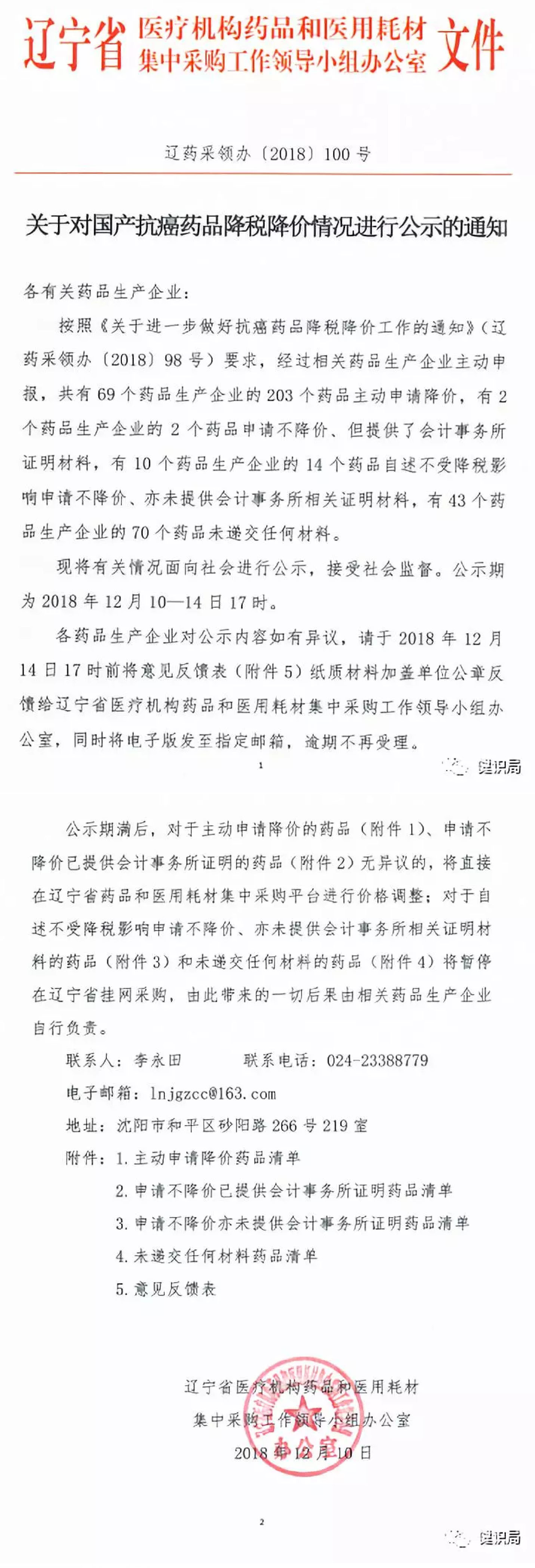 《通知》显示,按照《关于进一步做好抗癌药品降税降价工作的通知》要求,经过相关药品生产企业主动申报,共有69个药品生产企业的203个药品主动申请降价,有2个药品生产企业的2个药品申请不降价,但提供了会计事务所证明材料。