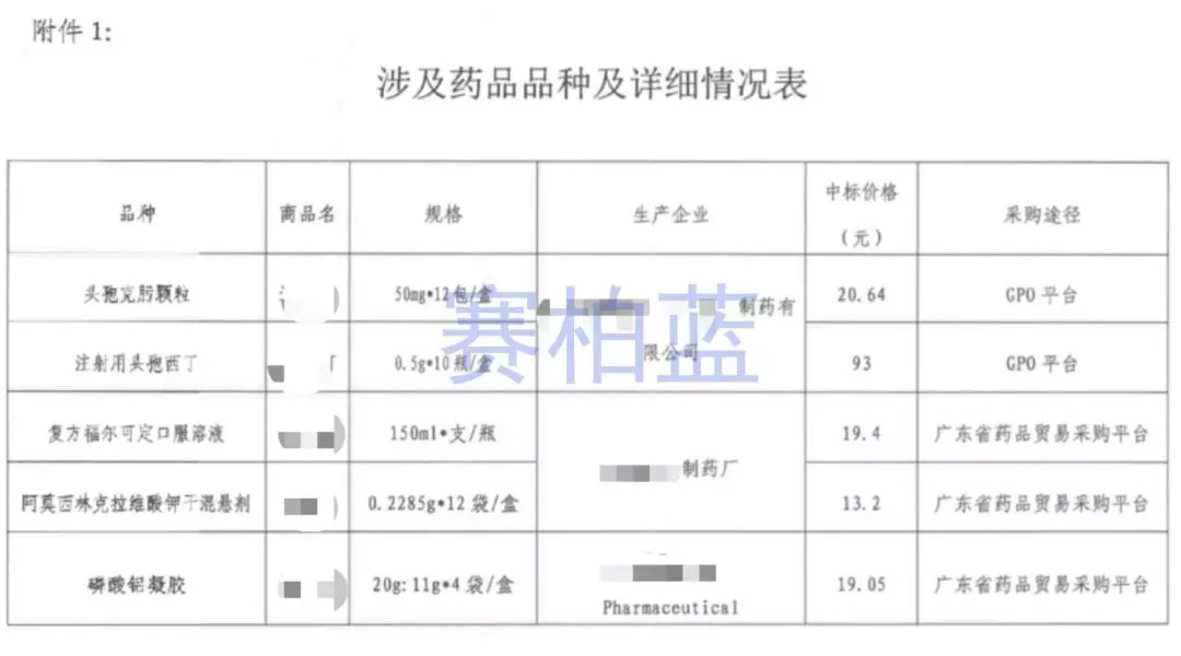 头孢克肟颗粒、注射用头孢西丁、复方福尔可定口服溶液、阿莫西林克拉维酸钾干混悬剂、磷酸铝凝胶,共涉及三家药企。