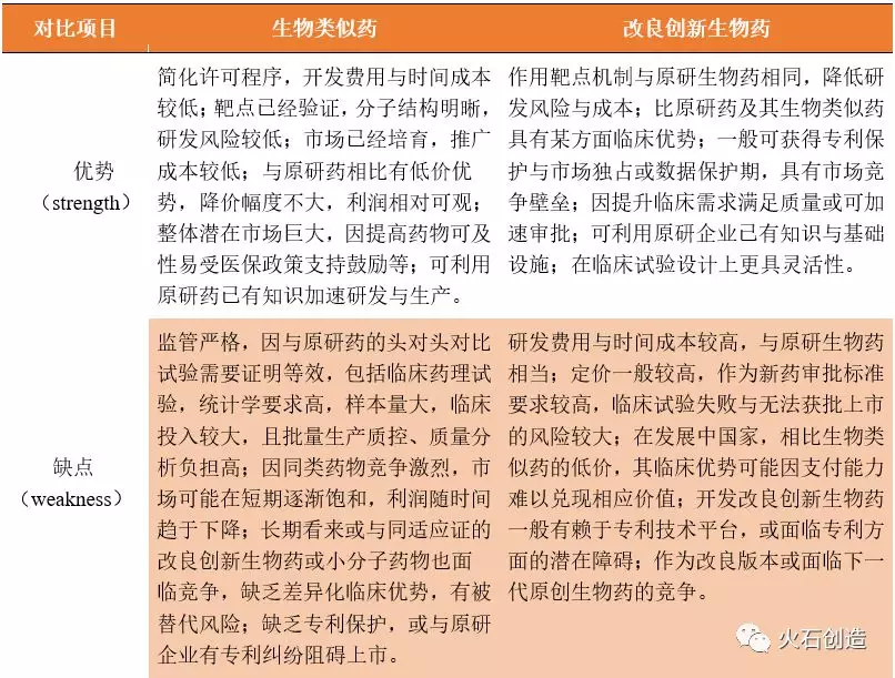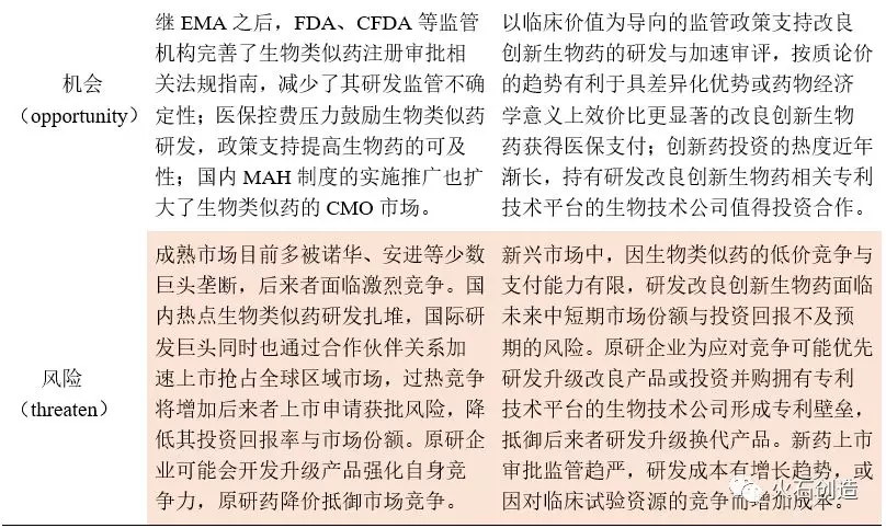 表5 生物类似药与改良创新生物药的SWOT分析对比