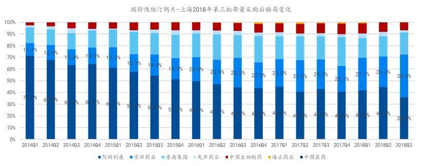 比如京新药业的瑞舒伐他汀,2018Q2上海地区市场份额约为21.3%,2018Q3市场份额已提高至36%。并且上海带量采购只执行9月一个月,可以预期,此品种在2018Q4可能会达到更高的市场占比。