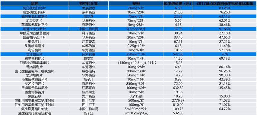 其中:通过一致性评价的仿制药22个,占88%,原研药3个,占12%。与试点城市2017年同种药品最低采购价相比,拟中选价平均降幅52%,最高降幅96%。原研药吉非替尼片降价76%,福辛普利钠片降价68%。