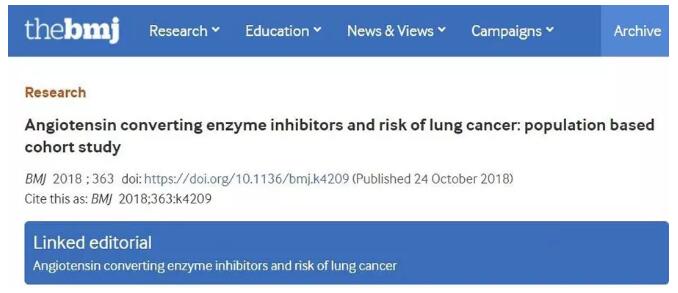 在英国,每年会开出超过7000万张降压药处方,其中约32%是ACEI类药物。如此广泛的受众群体,让研究人员不禁萌发了进行长期评估的想法。另外,据研究作者Azoulay及其同事指出,虽然早期的观察性研究报道了使用ACEI类药物癌症风险的评估,但没有一项是专门设计用来评估肺癌的。