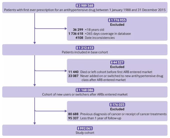 为了验证ACEI类药物和肺癌的关系,研究人员使用了来自英国临床实践研究数据链(Clinical Practice Research Datalink)的数据,对1995年1月至2015年12月期间使用降压药治疗的992,061例患者进行了随访,患者年龄均在18岁以上。