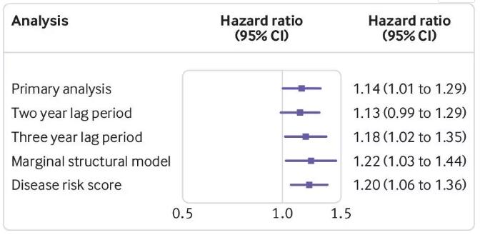 此外,最让人震惊的是,相较于使用ARB类药物(HR:1.14),对于使用ACEI类药物5年的患者,患肺癌的风险增加了22%(HR:1.22)。对于使用ACEI类药物10年或更长时间的患者,肺癌风险增加竟高达到31%(HR:1.31)。