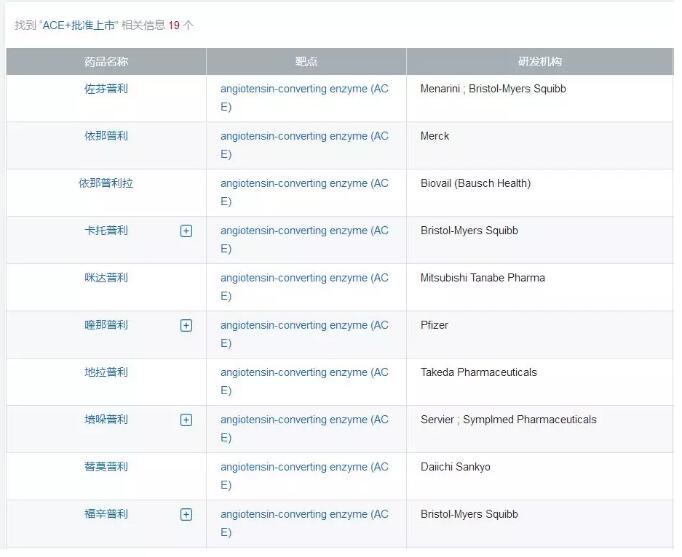 ACEI类药物在临床上的使用,历史悠久。第一种含有非巯基的ACEI类药物开博通(卡托普利)于1981 年获得美国FDA批准。至今已近37年,在临床上,仍然有它的身影。据医药魔方数据库显示,目前已有19款ACEI类药物药物获批上市。