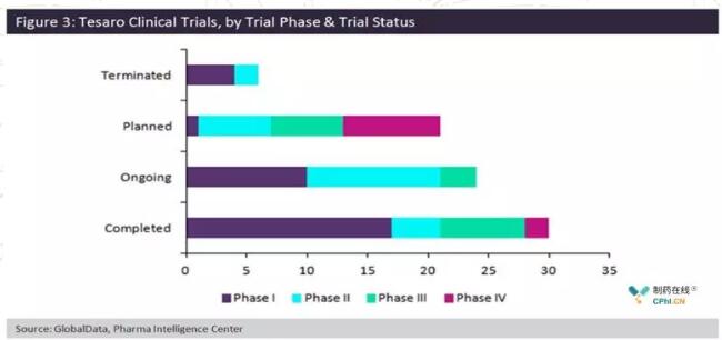 图3 TESARO临床试验分析(试验阶段和试验状态) 图片来源:GlobaDate数据库