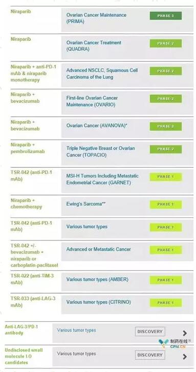 图4 TESARO目前在研的研发管线产品(图片来源:TESARO官网)