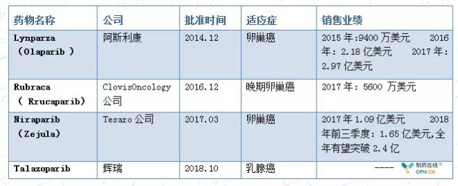Tesaro公司是一家专注于肿瘤领域药物研发的制药企业,创立于2010年。其卵巢癌新药Niraparib(商品名Zejula)2017年3月获得FDA批准上市,是目前全球上市的四大PARP抑制剂之一,也是第一种使用时不需要进行相关生物标志物检测的PARP抑制剂,第一个被批准作为对化疗有应答的卵巢癌患者的维持治疗的PPAR抑制剂,上市第一年销售业绩既达到1.09亿美元,目前的市场份额仅次于阿斯利康的Lynparza(Olaparib )。四款PARP抑制剂的销售业绩详见表1: