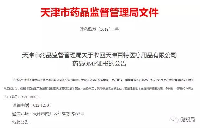 日前(12月12日),天津市市场监督管理局发布公告称,接投诉举报对天津百特医疗用品有限公司进行调查期间,发现该公司在设备管理、生产管理、偏差管理等方面存在违反《药品生产质量管理规范》相关规定的行为,依据《药品生产质量管理规范认证管理办法》第三十三条规定,天津局依法收回该企业大容量注射剂(三层共挤输液用袋,4号线)《药品GMP证书》(编号:TJ 20180137)。