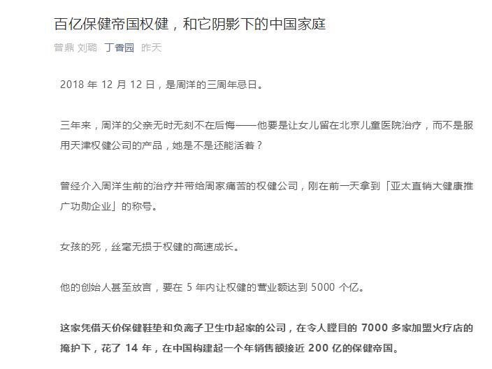 该文章曝出内蒙古女童周洋在四岁时被诊断身患恶性生殖细胞瘤,在北京儿童医院进行治疗,并先后进行了4次手术23次化疗,在丁香园的文章中转述了周洋的主治医生对于治疗的描述:过程很痛苦,治疗不算顺利(不过在周洋出院时,其肿瘤标志物已经恢复到了基本正常的水平)。其后,一位权健的联络人找到周洋的父亲周二力,对方告诉周二力,他们花了八千万买回来一个中药秘方可以治好周洋的病,由于不忍心女儿再接受化疗的痛苦,周二力中断了周洋在北京儿童医院的治疗,前后花了约两万元选择了权健的保健品,但是在周洋服用权健的保健品后,病情没有任何起色,相反肿瘤标志物数值却持续上升,病情不断恶化,2015年12月,周洋在痛苦中去世,今年刚好是周洋去世三周年,周二力愤然诉诸媒体。