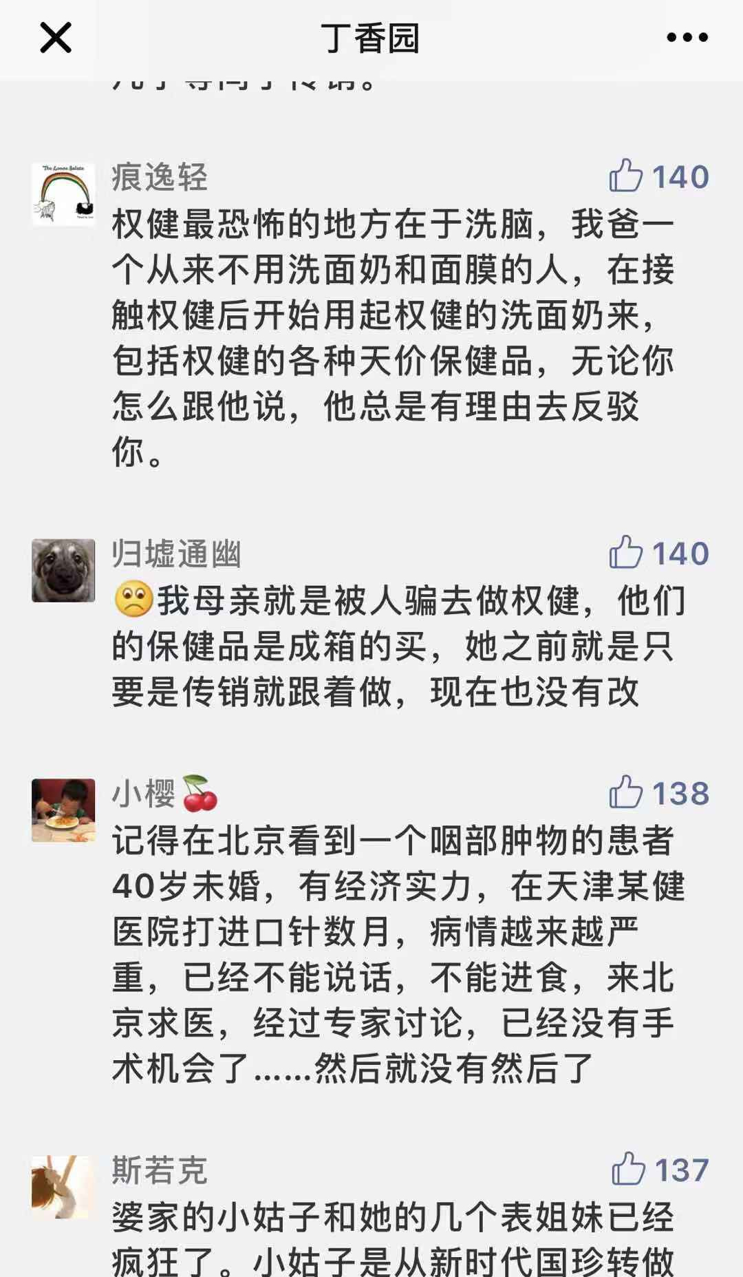 在丁香园昨天报道的下方评论中,也得到了很多网友的呼应,有的网友表示自己的亲人曾经或者现在均遭受了权健的洗脑,并成为权健的代理,给家庭和家人带来了不好影响。