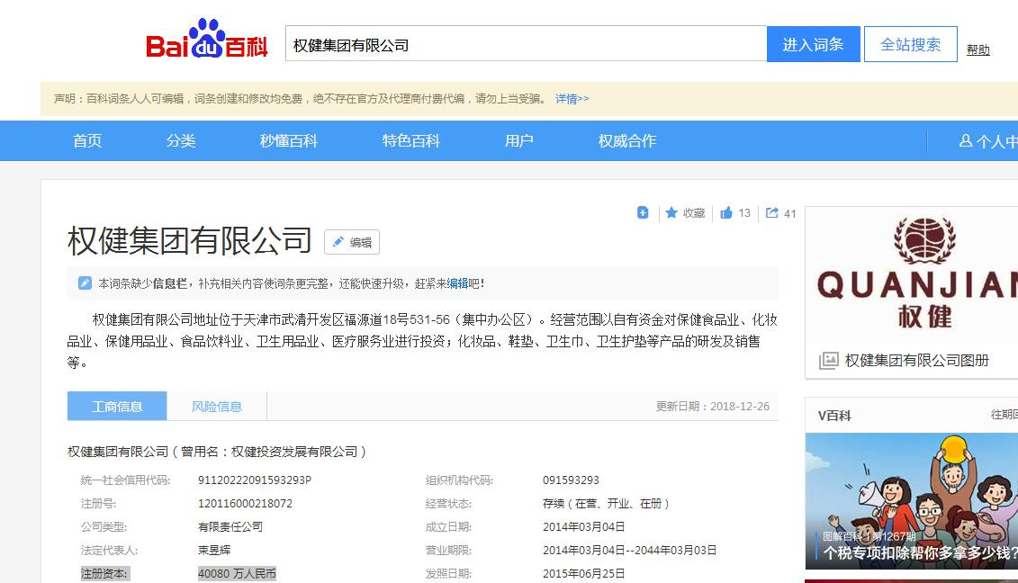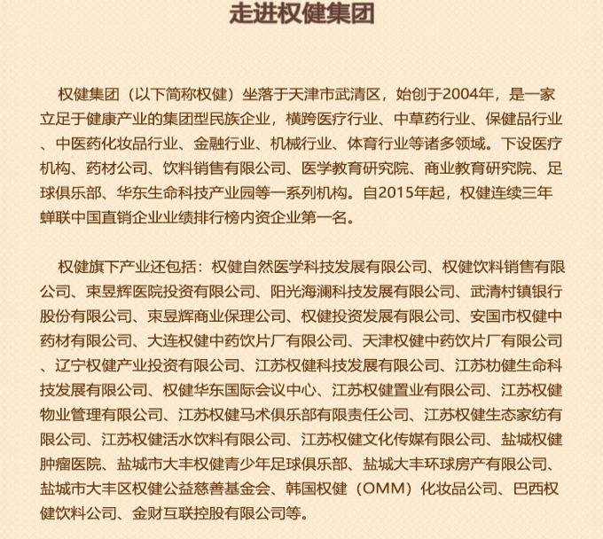 根据医谷小编的百度查询,权健全名为“权健集团有限公司(曾用名:权健投资发展有限公司)”,地址位于天津市武清开发区福源道18号531-56(集中办公区),法定代表人为束昱辉,根据工商信息,权健集团有限公司注册资本4.008亿元,由束昱辉持股51.1%,儿子束长京持股48.9%。经营范围以自有资金对保健食品业、化妆品业、保健用品业、食品饮料业、卫生用品业、医疗服务业进行投资;化妆品、鞋垫、卫生巾、卫生护垫等产品的研发及销售等。