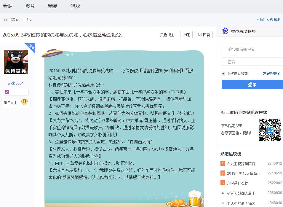 另外,百度贴吧上还有一个“反权健吧”,在这个贴吧中,不少曾经权健的经销商在吧中表示,权健的经销商会员体系,实质上就是金字塔式的传销团队行为,有网友还专门贴出了权健传销组织的洗脑常用招数。