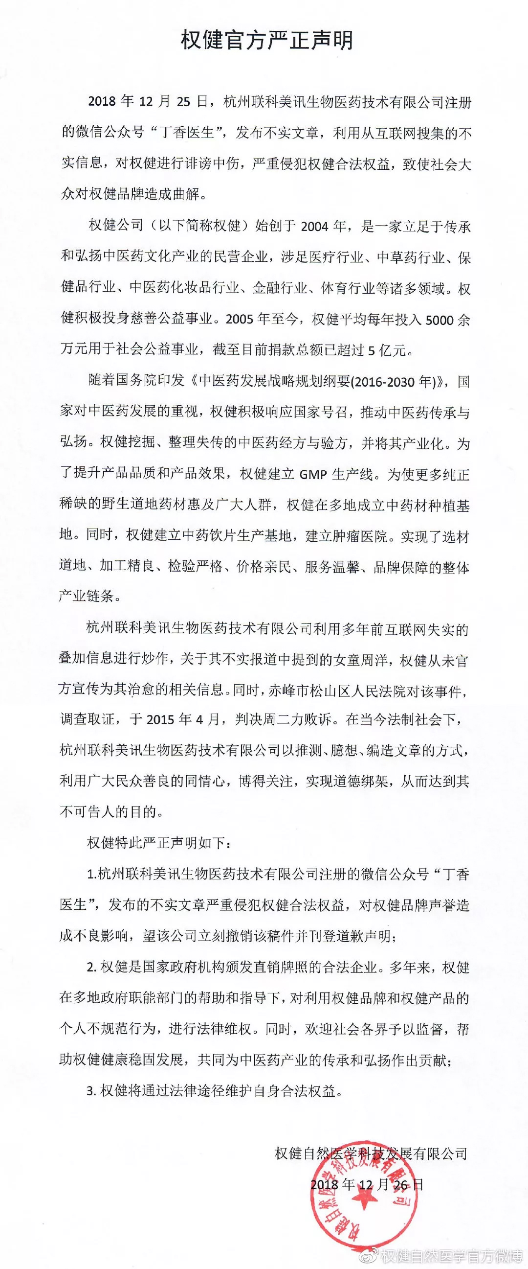 今日凌晨(12月26日),权健自然医学科技发展有限公司通过其官方微信号、官方微博和公司官网发布“严正声明”,指责“丁香医生”“利用从互联网搜集的不实信息,对权健进行诽谤中伤,严重侵犯权健合法权益,致使社会大众对权健品牌造成误解”;声明还要求“丁香医生”撤稿、道歉,权健称还将通过法律途径维护自身权益。