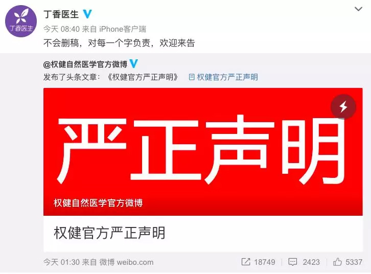 权健凌晨发声明称是“诽谤”,丁香医生回应“对每一个字负责”