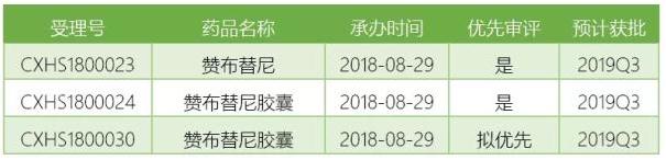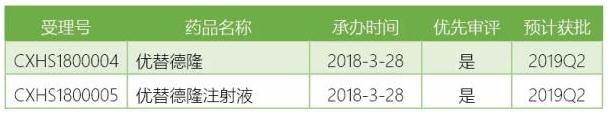 2018年03月28日,CDE承办优替德隆上市申请,纳入优先审评,目前该药物的技术审评完成,预计在2019Q2获批。