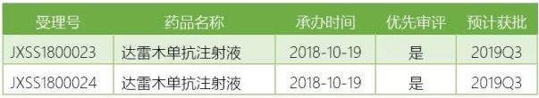苏金单抗是CDE在今年11月1日正式发布的第一批40个临床急需境外新药之一,按照CDE文件要求可以免国内临床试验直接申请上市,并享受CDE专门通道加快审评。2018年9月21日,苏金单抗的上市申请获得承办受理,并纳入优先审评,预计将在2019Q3季度获批。