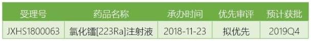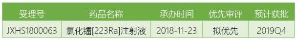 去势抵抗前列腺癌患者一般伴有高骨转移风险,骨转移使得前列腺癌患者死亡风险提高。2018年11月23日,拜耳向NMPA递交氯化镭[223Ra]注射液上市申请,进入优先审评,预计在2019Q4获批。