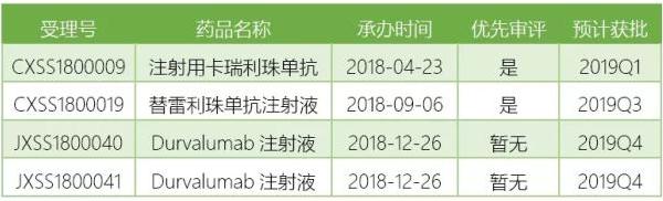 恒瑞医药卡瑞利珠单抗、百济神州替雷利珠单抗均处于审评阶段,申请适应症均为复发或进展霍奇金淋巴瘤,已纳入优先审评,临床数据显示卡瑞利珠单抗,替雷利珠单抗可使复发或进展霍奇金淋巴瘤患者ORR达84.8%,85.7%。药物预计将在2019Q1-Q3先后获批。2018年12月26日,阿斯利康PD-L1单抗Durvalumab注射液上市申请获CDE承办,预计2019年Q4获批,成为首个在国内获批上市的PD-L1单抗。