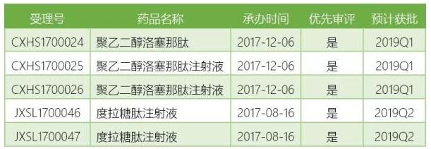 聚乙二醇洛塞那肽(豪森)、度拉糖肽(礼来)均为每周注射1次的长效GLP-1受体激动剂,可以给广大糖尿病患者带来给药上的便捷性。礼来以“以含中国数据的国际多中心试验结果申请免临床”而进入优先审评,可以直接批准上市,但从审评进度上看,豪森的三合一审评已经完成,略快于礼来。