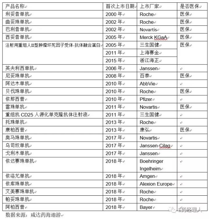 自2000年以来,我国上市的单抗类药品超过20个。2017年注射用重组人Ⅱ型肿瘤坏死因子受体-抗体融合蛋白和巴利昔单抗进入医保目录,2017年和2018年谈判药品中都有单抗产品进入医保。