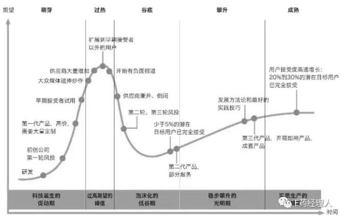 期望膨胀期(Peak of Inflated Expectations)时,技术逐步成型,一些激进的公司开始跟进。媒体开始大肆报导,产品的知名度达到高峰。早期公众的过分关注演绎出了一系列成功的故事——当然同时也有众多失败的例子,但是面对失败趋势,仅部分公司采取了补救措施,而大部分却无动于衷。当技术处于膨胀期最高峰时,媒体会对其的前景十分乐观,大部分会出现被吹捧过度的情况,投资者们纷纷涌入,满怀热情地投资这些技术。生物制品市场潜力、媒体的报道、高技术门槛、科技论坛等等都给了国内企业对单抗类似药、PD-1/PD-L1、CART的市场非常高的期望。