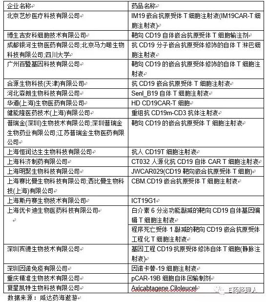 表三:靶点CD19的CART产品