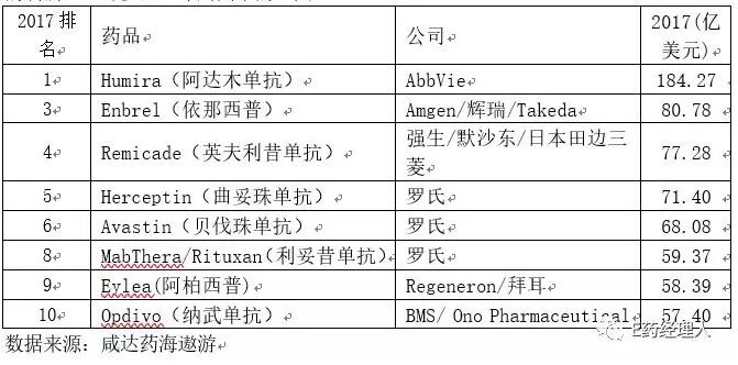 2017年全球排名10大药品中共8个生物药,都是单抗;单抗之王修美乐继续以184亿美元继续排名第一,罗氏当家品种三大单抗销售额虽然有所下降,但总销售额也接近200亿美元。原研药的市场潜力如此吸引,生物类似药的研发不仅仅是中国,在全球也呈现蓬勃之势。生物类似药空间大、重磅多、壁垒高,降价幅度低(10%~35%),可以获得更大的市场和更高的利润,是许多企业布局其中的原因。
