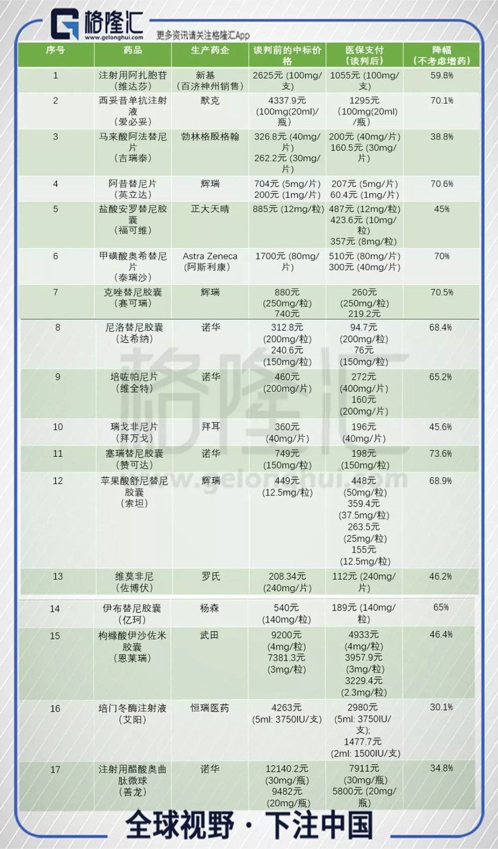 创新药的压价就靠谈判目录。今年第三批谈判目录,共纳入17个品种,其中15个进口药品,2个为国产药品(正大天晴:安罗替尼、恒瑞医药:培门冬酶注射液)。有意思的是,这17个品种中有10个品种为近2年上市的新品种(2017年和2018年上市的),2017年CFDA一共就批准了7个靶向抗肿瘤药的上市,全部都进入了这次的谈判目录,最后只有诺华的芦可替尼(捷恪卫)没有谈判成功,其他6个均降价进入了谈判医保目录,看来,国家对新药的支持度和关注度不小。新药刚上市,其实销售网并没有全面铺开,销量都不算大,对药企的影响或者说打击并不算大,谈判目录一来是为了降价,二来为的就是加快新药下沉的速度,尽快完善市场的布局,从侧面看,是创新药的研发的另一种鼓励。