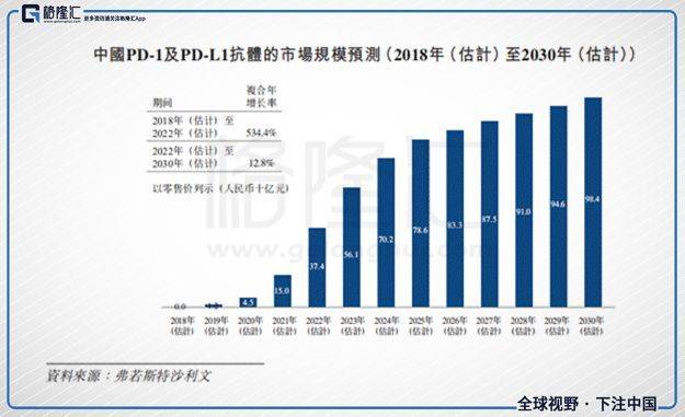 国内的PD-1形成了2+4的竞争格局,2家跨国药企:BMS、MSD,4家本国药企:恒瑞医药(600276.SH)、百济神州(6160.HK、BGNE.O)、信达生物(1801.HK)、君实生物(833330.OC,1877.HK)。随着今年8月30日百济神州的治疗复发/难治性经典型霍奇金淋巴瘤的BGB-A317(Tislelizumab)正式提交上市申请,国内PD-1一梯队的4强争霸赛也正式打响。预计到2022年,中国的PD-1/PD-L1的市场规模将达到374亿元人民币,年复合增长率达到534.4%。