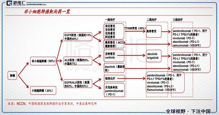 非小细胞肺癌是肺癌中最常见的病症,占到肺癌总数的80%以上,目前确诊后多为晚期,医院的治疗方案有替尼靶向药物治疗、单抗靶向药治疗和免疫治疗等。现在大热的PD-1/PD-L1来抢占非小细胞癌的市场,所以现在替尼类药物和PD-1/PD-L1为主力军。