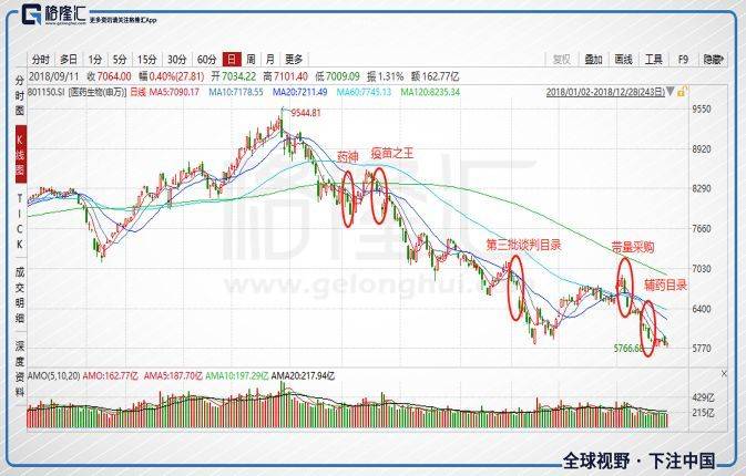 6月开始,受到中美贸易摩擦、全球股市的影响,医药股也开始松动,前期板块涨幅过大,随着药神的热映、疫苗事件的爆发,医药板块下跌之路一触即发。从9月网传国家版带量采购试点方案流出开始,市场恐慌情绪开始蔓延。疫苗事件、谈判目录、带量采购、辅药目录接二连三地出台,让2018年过得特别艰难,“黑天鹅”的一年推动着行业进入重塑的元年。