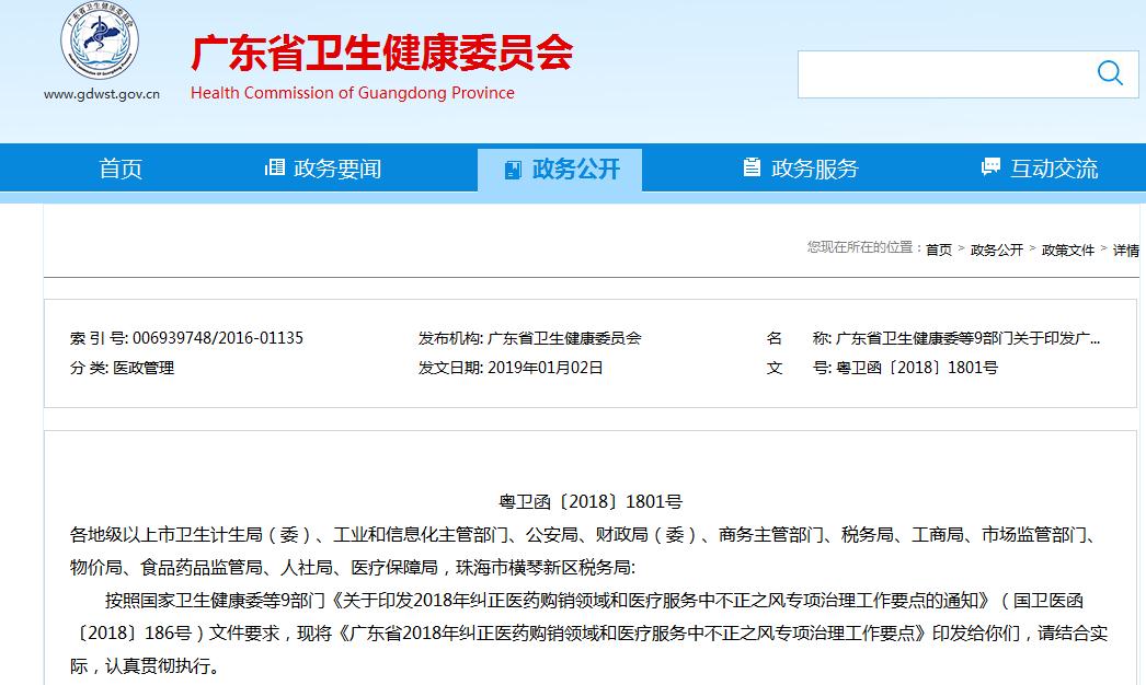 昨日(1月2日),广东省卫健委等9部门联合下发《关于印发广东省2018年纠正医药购销领域和医疗服务中不正之风专项治理工作要点的通知》(以下简称通知),对医药代表进行了“严控”。