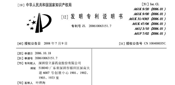 2015 年,泰嘉凭借“氯吡格雷硫酸盐的固体制剂及其制备方法,专利号 ZL200610063151.7”荣获中国专利金奖。申请日,2006.10.18;专利权人,深圳信立泰药业股份有限公司;发明人,叶澄海;权利要求,2项;全文6页。
