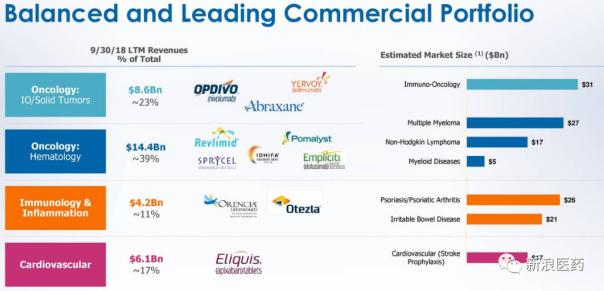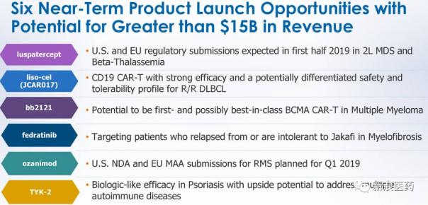 此外,合并后还将有6个产品即将上市,其中4个是血液肿瘤领域产品,包括luspatercept、lisocabtagene maraleucel(liso-cel; JCAR017)、bb2121和 fedratinib,另外两个是免疫肿瘤和免疫炎症,分别是TYK2 和ozanimod。