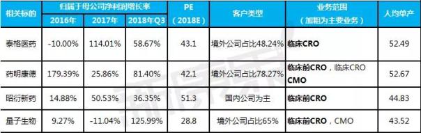 目前,涉及CRO行业的A 股上市公司中主要包括药明康德、泰格医药、昭衍新药、量子生物、百花村等。客户类型中以国外公司为主的有量子生物、泰格医药,泰格医药境外业务占比近50%。业务范围方面,泰格医药主要以临床CRO为主,药明康德、量子生物、昭衍新药主要以临床前CRO为主,其中昭衍新药主要从事临床前CRO中的安全性评价服务。估值方面,截止2019年1月3日,昭衍新药PE(2018E)为51.3倍,泰格医药和药明康德估值相对均为40多倍,睿智化学从2018年6月开始纳入公司合并报表范围,其PE(2018E)为28.8倍。