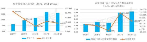 截止2018年前三季度,公司营业收入15.94亿元,同比增长35.70%,近四年复合增长率39.27%;归属于母公司净利润为3.18亿元,同比增长58.67%,近四年复合增长率33.86%。