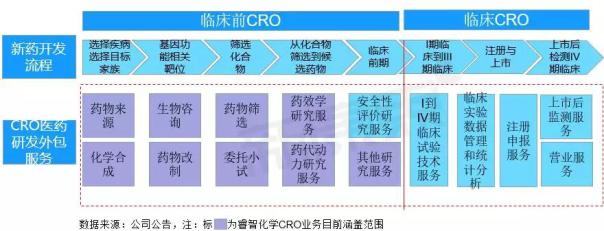 睿智化学除涉及临床前CRO领域外,还涉及合同外包加工领域(CMO)。根据广发证券股份有限公司于2018年5月发布的《关于量子高科(中国)生物股份有限公司发行股份及支付现金购买资产暨关联交易之独立财务顾问报告》显示,截止2017年9月,上海睿智化学CRO业务已实现收入61,336.81万元,在手订单金额约1亿美元,预测企业2017年至2022年CRO业务的收入增长率从20%逐年放缓至10%;CMO业务已实现收入10,479.01万元,在手订单金额为约2,000万美元,预测2017年至2022年CMO业务的收入增长率从50%逐年放缓至15%。
