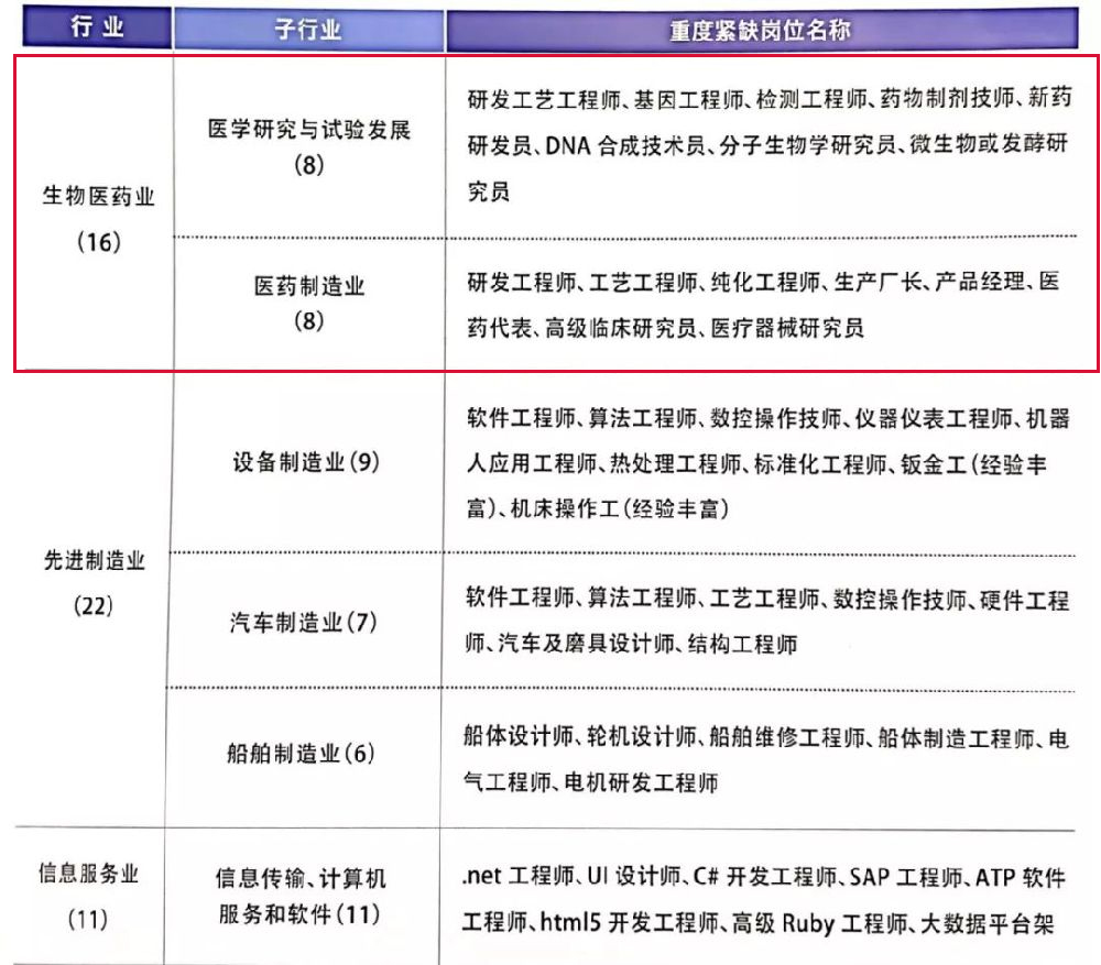 生物医药业中,医药研究与试验发展紧缺程度加重,由紧缺变为重度紧缺。浦东新区人才市场总经理王万鹏表示,尤其是对于研发工艺工程师、基因工程师这类岗位需求大,另外,检测工程师、药物制剂技师、新药研发员、DNA合成技术员、分子生物学研究员、微生物或发酵研究员等也是重度紧缺岗位。