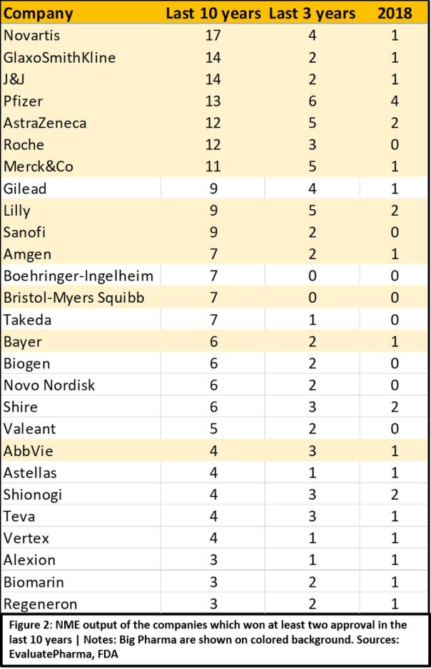 值得注意的是,在2018年中,大型制药公司仅有16个新分子实体(NME)获批,占比仅为26%,在过去10年中,这一比例通常在35%-40%之间。