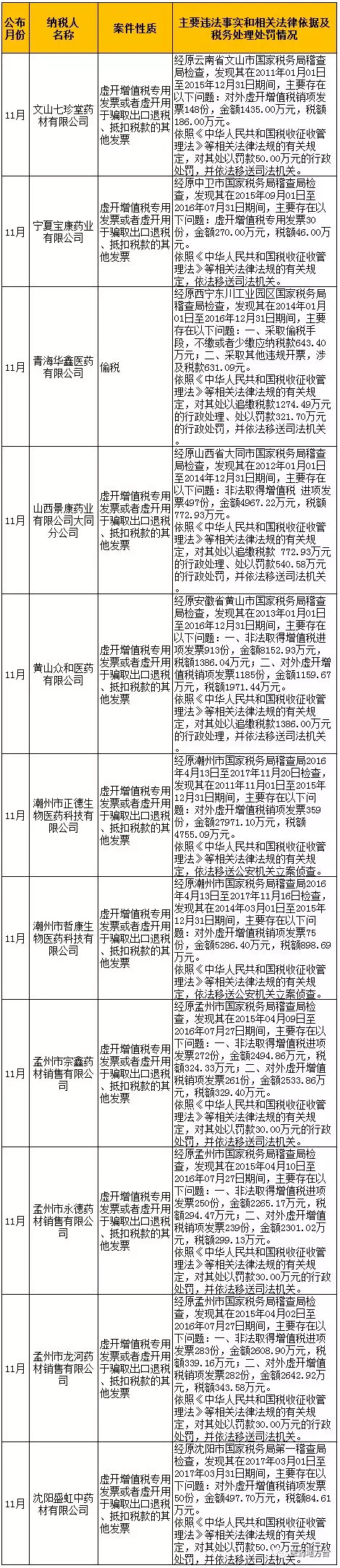 1月21日,医药地方台从国家税务总局获悉,在公布的2018年11月的重大税收违法案件信息中,有11药企被通报。