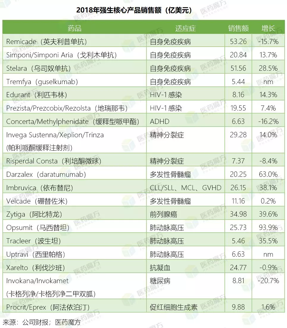 强生拥有Imbruvica(伊布替尼)在美国以外市场的开发权利归强生所有,并于2017/8/30成功拿到Imbruvica在中国的上市资格,用于二线治疗CLL/SLL/MCL等B细胞淋巴瘤。广泛的适应症和不断扩大的使用国家范围支持了Imbruvica较高的增速,2018年强生从Imbruvica身上获得26.15亿美元的收入。