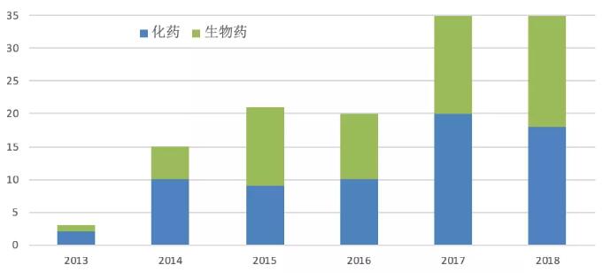 2013-2018年FDA批准上市的突破性药物数量(按适应症计)