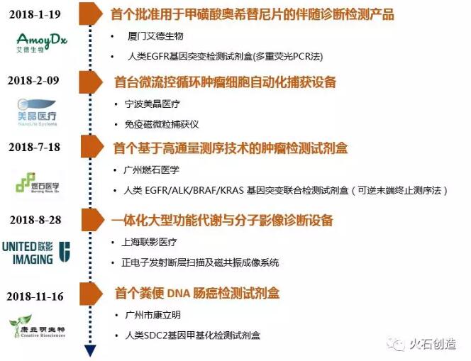 在创新审批政策的推动下,2018年医疗器械领域重点产品获批频繁,如康立明生物首个粪便DNA肠癌检测试剂盒、燃石医学首个基于高通量测序技术的肿瘤检测试剂盒、宁波美晶首台微流控循环肿瘤细胞自动化捕获等均在2018年获批上市。总体来讲,国内创新医疗器械不断实现零的突破,进口医疗器械国产可替代速度持续加快。