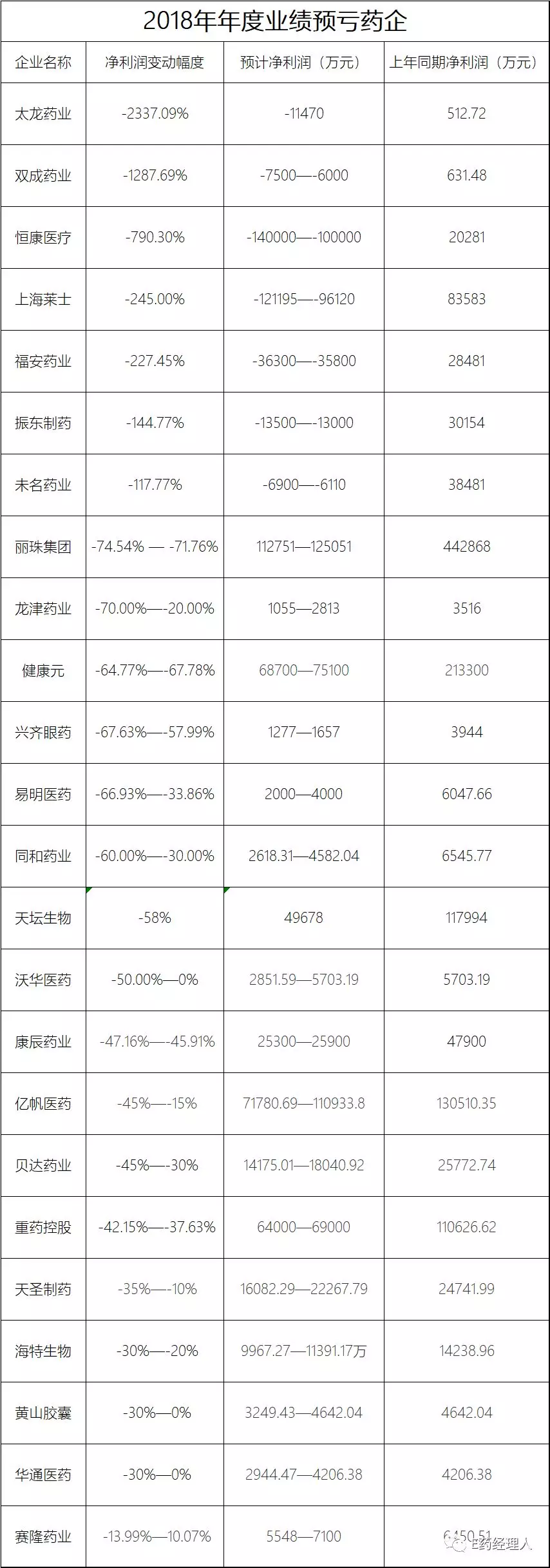 梳理目前已公布的1899家企业业绩预告,E药经理人发现今年有至少24家医药板块企业业绩预减,其中跌幅超过100%的有7家,即意味着将由盈利转亏损,究其原因则五花八门,其中受政策、并购、停产和原材料涨价影响的较为多见。业绩预喜的企业也不在少数,净利润翻倍的至少有6家,其中华北制药和疫苗板块较为抢眼,但也有部分并非为业务所推动。