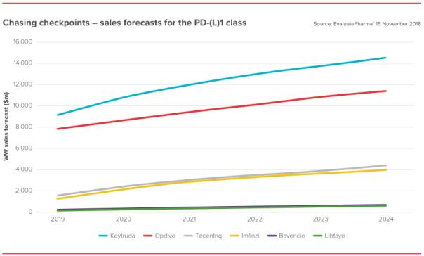 医药市场调研机构EvaluatePharma之前发布报告,预测Keytruda和Opdivo在2019年的销售额将分别达到91.7亿美元和78.0亿美元;到2024年,Keytruda预计将突破140亿美元,Opdivo预计接近120亿美元。EvaluatePharma还预测,罗氏Tecentriq和阿斯利康Imfinzi在2019年的销售额在20亿美元以下,2024年将达到40亿美元。